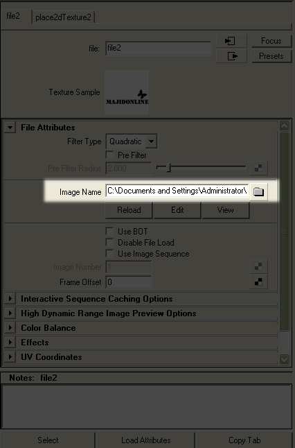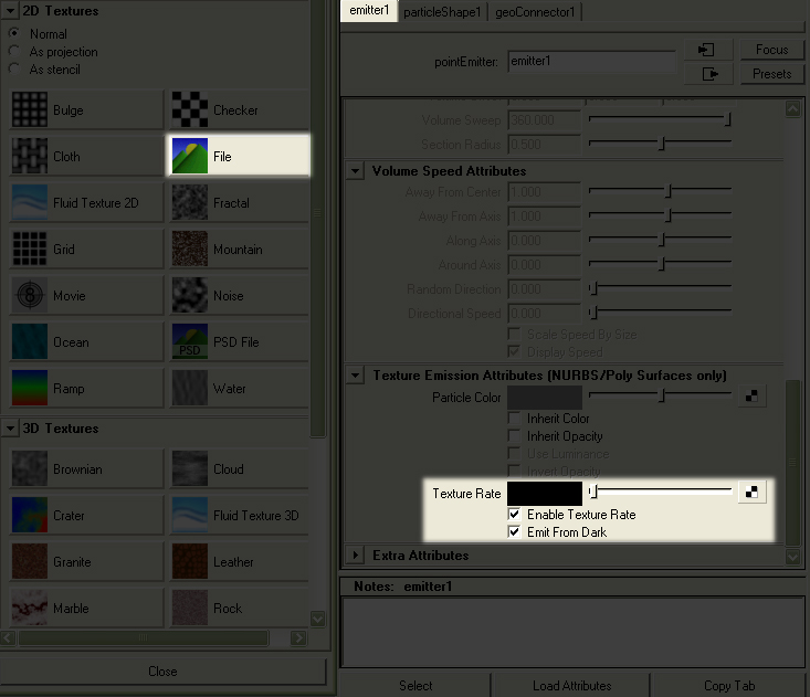 4- مطابق شکل با انتخاب emitter و زدن دکمه ctrl + a به attribute رفته و مربع شطرنجی را که در شکل مشخص شده را بزنید و از منویی که باز می شود بر روی گزینه فایل کلیک کنید حالا فایل خود را در فیلد خالی قرار دهید .